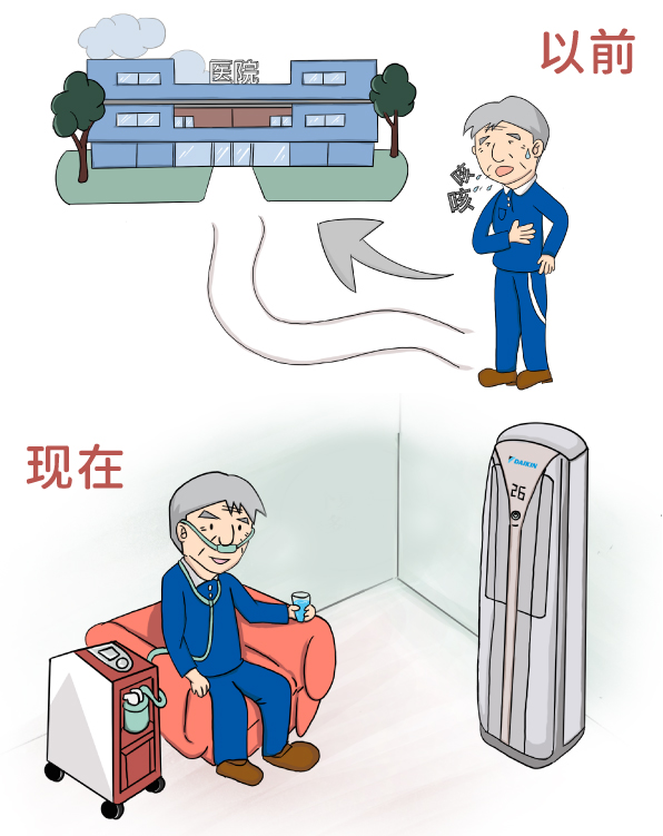 以前,病患為了吸氧不得不長期住院。但是自從有了制氧機(jī),就可以在自己家里吸氧了。